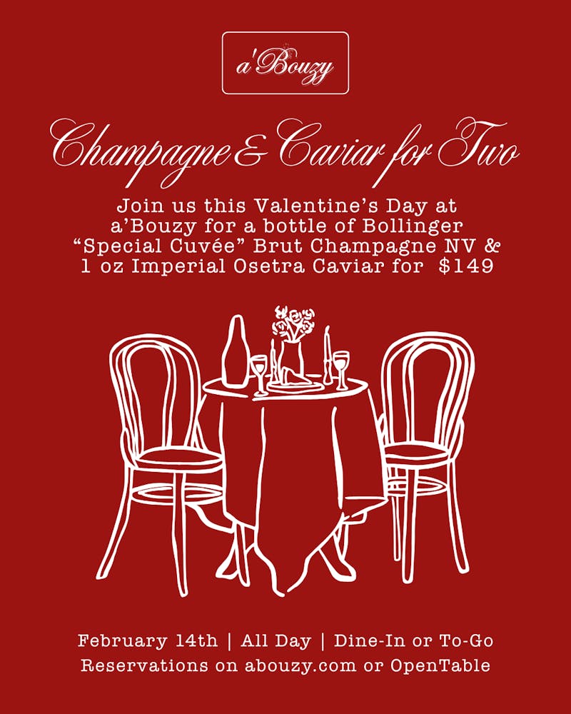 Celebrate Valentine’s Day with a timeless indulgence at a’Bouzy. Available all day on February 14, enjoy a special pairing featuring a bottle of Bollinger “Special Cuvée” Brut Champagne NV and 1 ounce of Imperial Osetra caviar for $149, while supplies last.