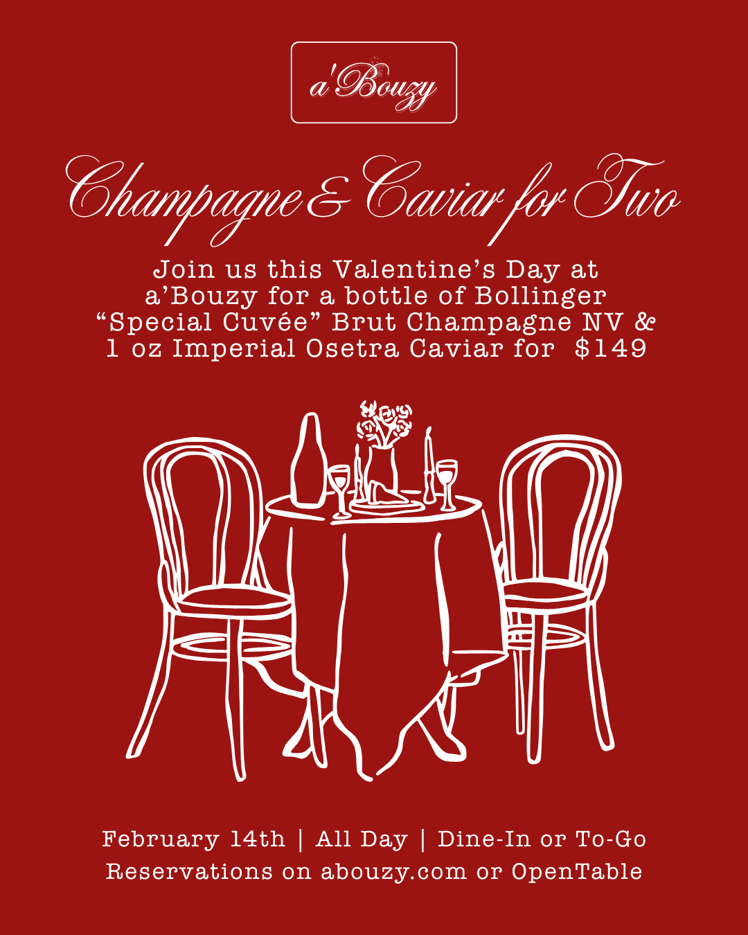 Celebrate Valentine’s Day with a timeless indulgence at a’Bouzy. Available all day on February 14, enjoy a special pairing featuring a bottle of Bollinger “Special Cuvée” Brut Champagne NV and 1 ounce of Imperial Osetra caviar for $149, while supplies last.