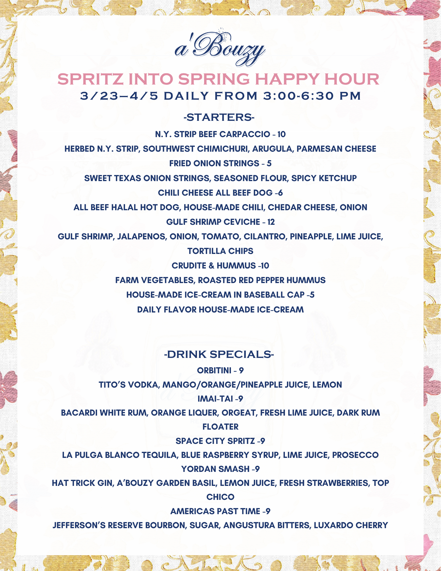 Ask your server for daily catch of fresh seafood and oysters*Please refrain from cigar smoking outside designated areas, no balloons inside, gratuity is not added automatically, consuming raw or undercooked meats, poultry, seafood, shellfish, eggs, or unpasteurized milk may increase your risk of foodborne illness